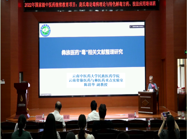 2022年8月12日-14日,云南省傣医药与彝医药重点实验室副主任陈清华应邀参加了2022年国家级中医药继续教育项目“庞氏毒论毒病理论与特色解毒方药、技法应用培训班” 暨第四届八桂庞氏毒学术流派研讨会。